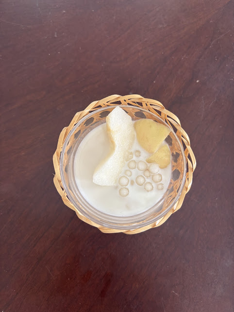 - 鍋に牛乳、ココナッツミルク、グラニュー糖を入れて火にかけ、煮立ったら火を止めて冷ましておきます。